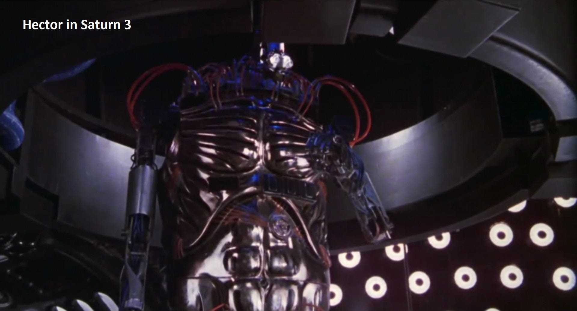 Category 2 is an interesting one and bridges the gap between manufactured A.I. and real intelligence from other or alien-like organisms. For example, I would not categorise Invasion of the Body Snatchers as a valid example as it fits too far over the spectrum where mankind did not mindfully get involved in creating the beings. A For Andromeda sits close to this area and is discussed as an example below. Saturn 3 is interesting and sits towards the mainly manufactured side of the spectrum as blank brain matter is injected with knowledge through some sort of transfer cable from its deranged creator (played well by Harvey Keitel) to a somewhat disturbing-looking mechanical robot called Hector. Hector begins to exhibit the violent tendencies of the creator and wreaks havoc on the isolated space station orbiting Saturn. In all the above cases, the being is based on either newly-created or existing brain tissue.