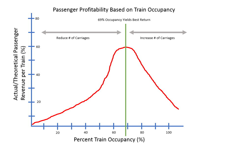 Ever-decreasing passenger numbers was, in part, to blame by the managerial decisions made to ensure that each carriage was near to 100% occupancy mistakenly believing if this works for airlines, surely it should work for railways as well. An empty seat was viewed as lost revenue; therefore, the corrective action to take was to shorten the train by removing carriages to ensure that the percentage of seats was near to 100%. Unfortunately, the factor of human nature was not factored in as it was discovered that most train passengers shun travelling on train services which are fully or almost fully-occupied and, instead, opt to take the car alternative. What this only created was a spiralling reduction of services whereby trains got shorter and shorter often being replaced by overcrowded, over-lit, noisy and uncomfortable Sprinter railcars. At this point, the service has already lost 90% of their potential passengers. The graph below illustrates this concept where having a seat occupancy of 69% is the ‘sweet spot’ and anywhere to the left of the green line means that some carriages can be removed and anywhere to the right indicates that more carriages should be inserted.