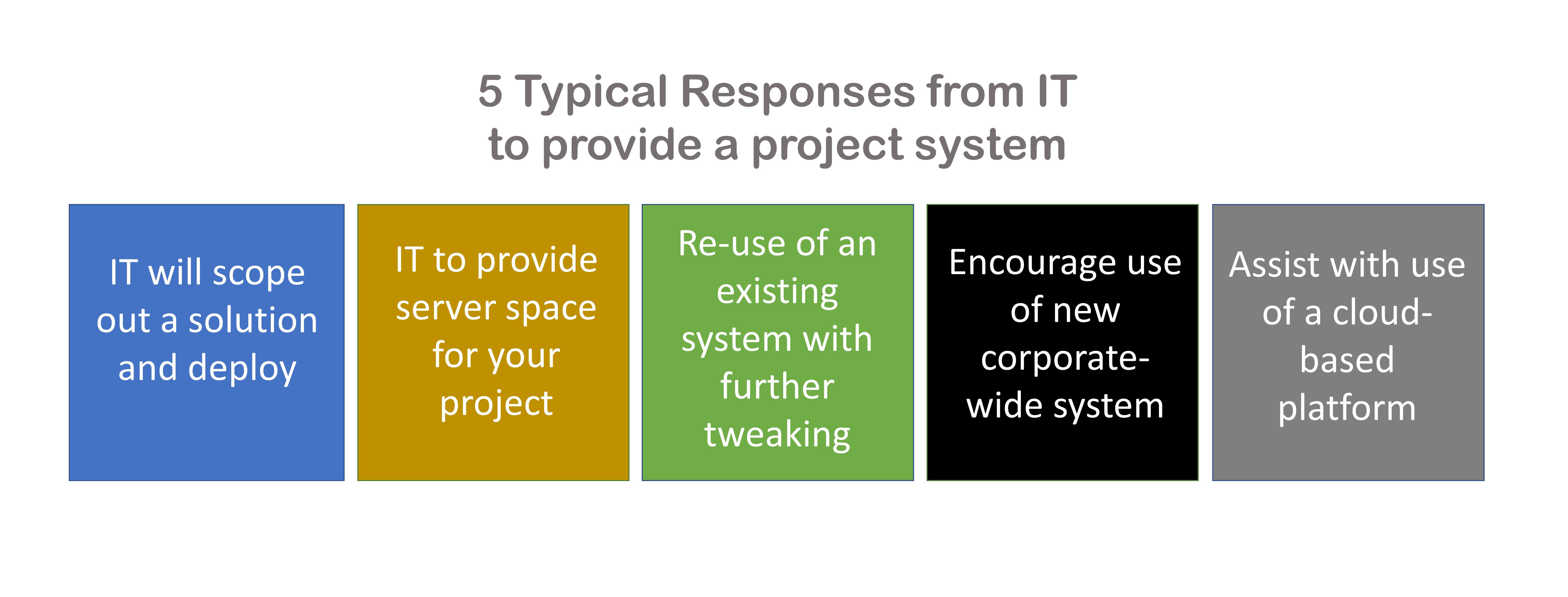 This option only works if, of course, you have someone within Projects who is technically able to put a system in place. If the system requires a complex (n-tier) web-driven application, this option is probably not suitable. However, saying that, I have seen a staggering array of powerful Wordpress themes and add-ons which can service complex database-driven websites with very little effort. No doubt the same will apply for Drupal and Joomla. In most cases, all that is usually required for many small to medium-sized projects is a database where data from spreadsheets can be migrated into coupled with a simple client application to update and retrieve the data. It is worth scouting around within your project team if there is sufficient expertise to build and adminster a system. If not, it could work out cheaper to hire someone with these skills to join the project directly rather than shelling out on Corporate IT services to undertake development.