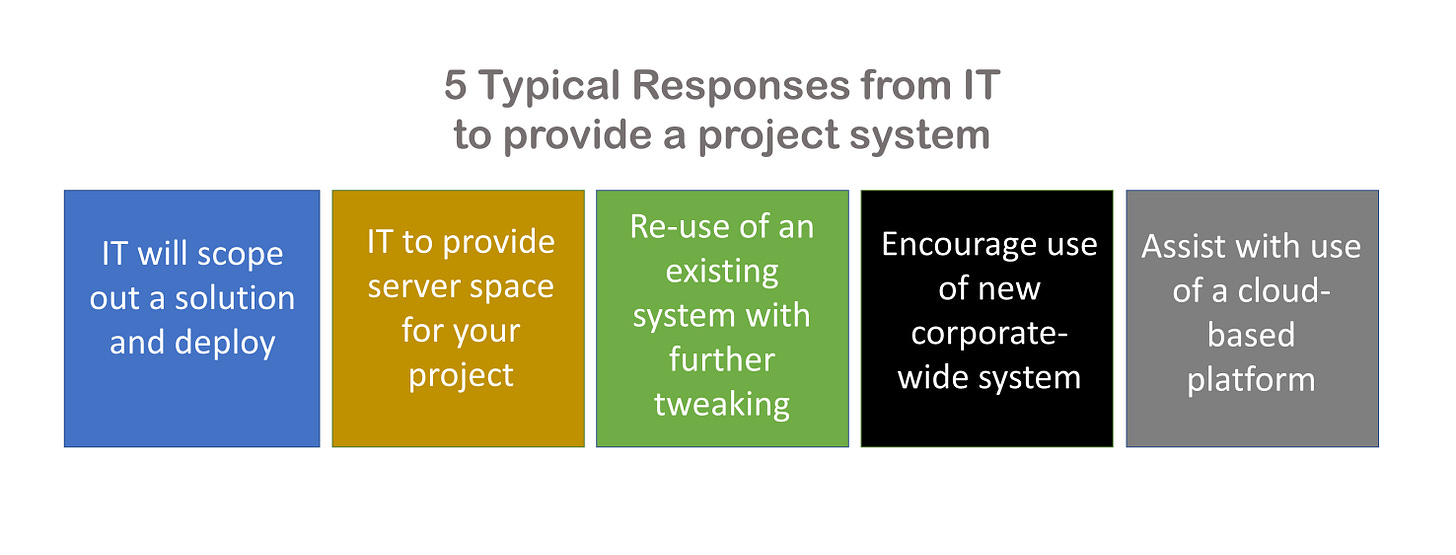 This is a solution that should send alarm bells ringing to your ears. In one of my earlier articles, Do You Really Need That Expensive Online Work Management System, I discussed the high risk of rolling out corporate-wide ‘all singing and all dancing’ one-for-all work management systems (WMS). Rolling out successful corporate-wide work management systems is a major undertaking and involves extensive continual interaction between Projects and Corporate IT through its lifecycle. If you get this response, ask if you can get a demonstration of how it works and do some testing with your project in mind. You also need to ask for a concrete date when the WMS will be formally released. If these are unanswered or not forthcoming, it is clearly too early to even comprehend going down this path. At this stage of the game, it is ‘vapourware’ as far as you are concerned and you should explore other options.